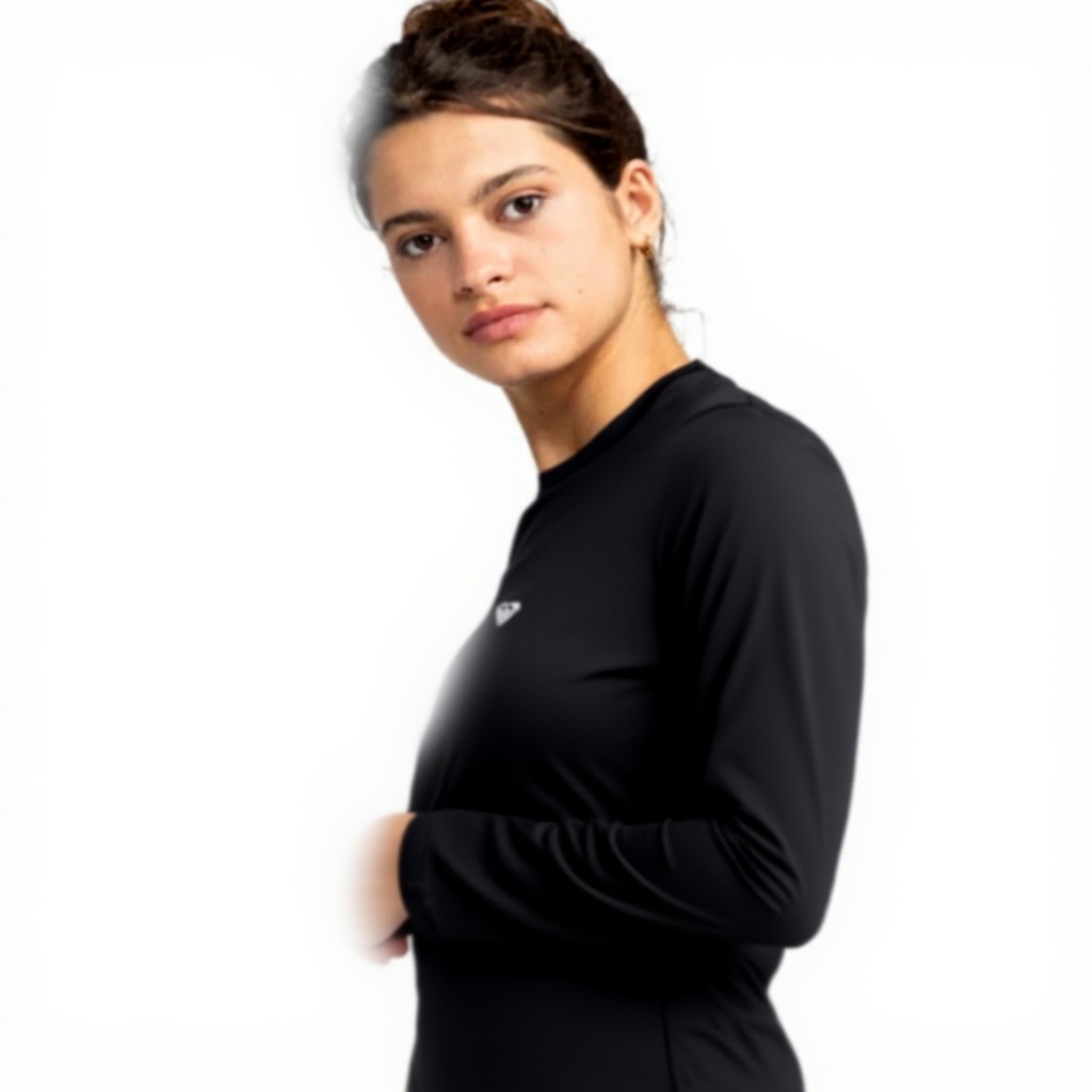 Disponibile nelle taglie XS, S, M, L, XL e XXL, questo top bikini si adatta a diverse conformazioni corporee. Il materiale principale è un jersey morbido ed elasticizzato composto da misto di nylon riciclato ed elastan, che assicura resistenza e rapidità di asciugatura. Il design include un girocollo classico e maniche lunghe per una copertura completa durante le attività sportive.