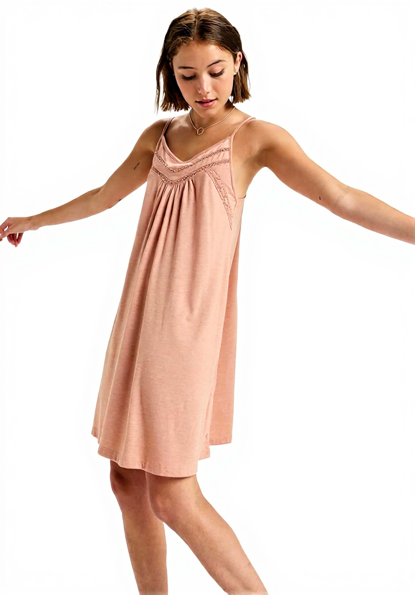 Il vestito si distingue per l’inserto ricamato sul davanti, un elemento che cattura la luce in modo sottile e aggiunge texture senza appesantire il design. Le spalline sono sufficientemente larghe da restare comode sulle spalle, mentre lo scollo arrotondato crea un effetto morbido che si adatta a diverse tipologie di fisico. La vestibilità regolare significa che non stringe né è troppo ampio, offrendo quella libertà di movimento che si apprezza quando si è in giro per commissioni o si passa un pomeriggio relax. Il tessuto, non specificato nei dettagli ma dalla descrizione implicita, sembra leggero e adatto a temperature miti, con una finitura che evita di attirare pelucchi o mostrare pieghe eccessive dopo qualche ora di uso.